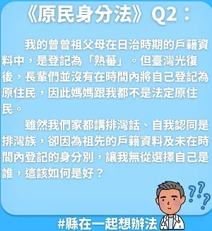 此類問題主要與 111 年憲判字第 17 號判決(平埔族群案)精神相關。該判決宣告《原住民身分法》未將平埔族群納入規範違憲,要求相關機關在 3 年內修法或另立專法。原民會已根據此意旨,提出《平埔原住民族群身分法草案》送請立法院審議,以規範平埔族群的身分認定與權益保障。
