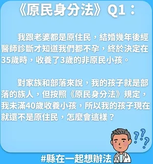 盧縣一委員在質詢中提出關於原住民族夫婦收養非原民兒童的年齡限制問題,指出「父母皆為原住民族」的夫妻若在 40 歲前收養一名非原民兒童,孩子無法立即取得原住民族身分,必須等到父母滿 40 歲才能取得。