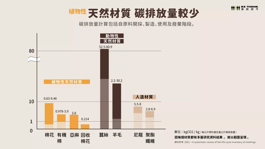 消費者在購買衣物時,可留意材質。動物性天然纖維與人造纖維碳排較高,選擇環保材質有助減少碳排放。【記者 陳彤瑾/擷取自RE-THINK】