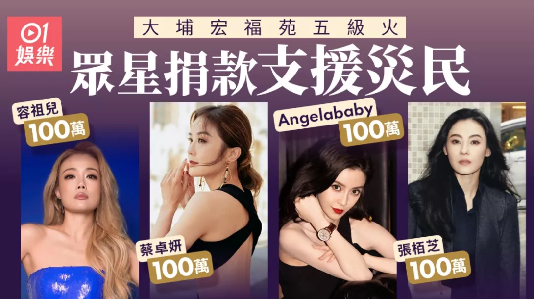 Angelababy,也轉發了仁濟醫院聲明,聲明指:「感謝善心人士楊穎小姐,在關鍵時刻挺身而出慷慨捐助港幣100萬元,支持『仁濟緊急援助基金』與大埔宏福苑災民並肩同行。」張栢芝亦透過工作室發聲,表示通過香港保良局捐贈100萬港元,專項用於火災緊急救援、受災民眾過度安置及生活物資補給等。