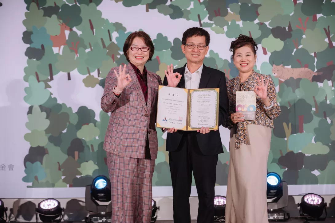 鴻海教育基金會執行長汪用和(中)代表鴻海精密工業股份有限公司受頒台灣尤努斯基金會永續天使1號證書,由台灣尤努斯基金會董事長蔡慧玲(左)、執行長王絹閔(右)頒贈。