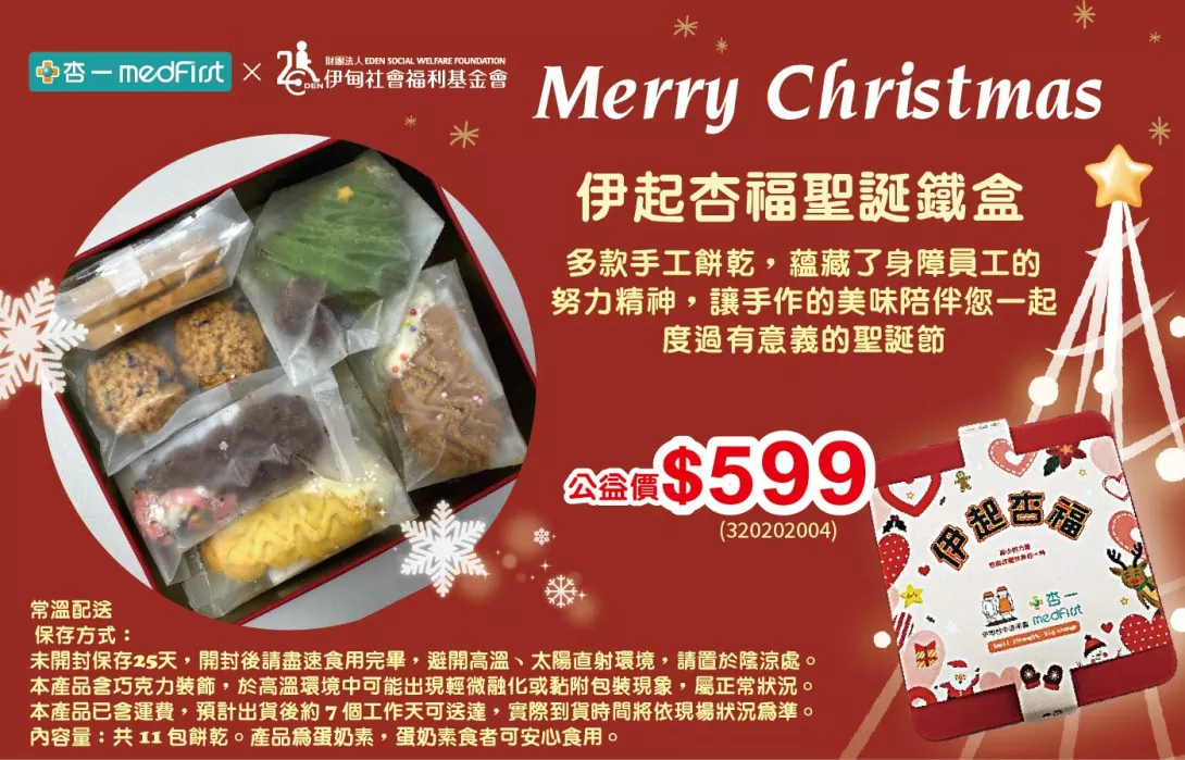 迎接溫馨聖誕節,杏一醫療用品與伊甸基金會台中市迦南園烘焙庇護工場攜手推出期間限定的「伊起杏福聖誕鐵盒」。禮盒內含多款手工餅乾,口味多元、風味樸實,象徵庇護員工在烘焙與包裝過程中投入的耐心與努力。公益價599元即可購得,是節慶送禮的好選擇。