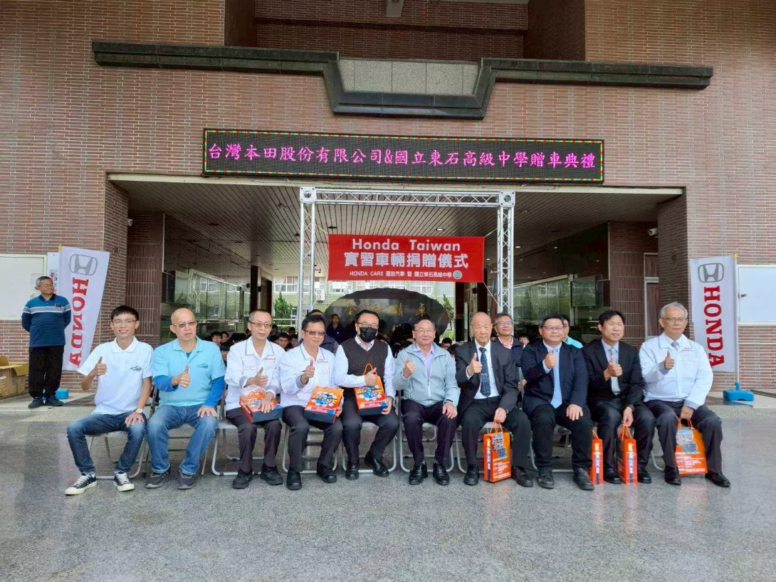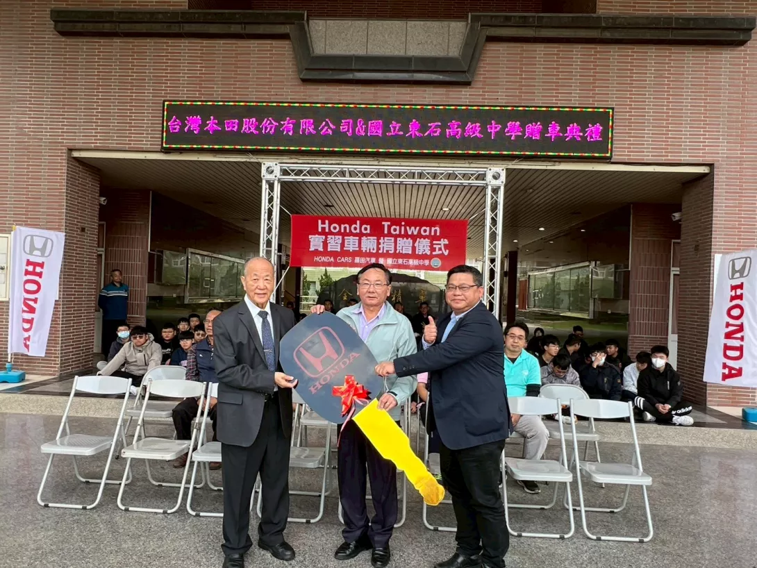 【嘉義訊】國立東石高中今(4)日舉辦「教學車輛捐贈儀式」,由台灣本田股份有限公司(Honda Taiwan)曁嘉田汽車聯合捐贈一輛實習教學用車,慶祝該校創校99週年暨汽車科創立四十週年,贈與活動邀請汽修科師生們共同參與見證,並致上感謝:企業對技職教育的支持與肯定。
