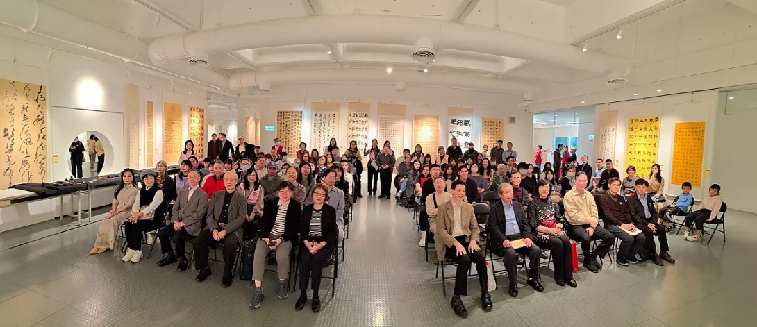 隨後進入致詞環節,首先由新竹縣文化局副局長郭秋燕致詞,代表主辦地表達對本次展覽的支持與祝福。接著由新竹縣文化基金會董事賴煥琳、中國書法學會顧問陳坤一、前北科大人文與科學學院院長蔡行濤,以及中國標準草書學會顧問施筱雲陸續致詞,從文化教育推動、兩岸書法交流到青年藝術培育等方面,分享本次展覽的重要意義與深遠期許。最後,由主辦單位中國標準草書學會黃勻祺理事長與中國書法學會陳銘鏡理事長以東道主身分致詞,強調兩岸書法文化交流的珍貴價值,並期待透過本次展覽讓標準草書精神持續在青年世代間延展與發光。