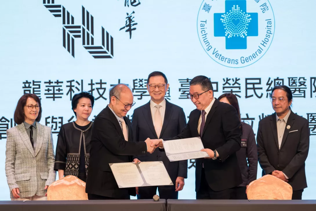 本次校慶亦迎來關鍵亮點,龍華科大與台中榮民總醫院的跨界合作正式啟動,由台中榮總朱元華副院長代表簽署 MOU。台中榮總連續入選全球百大醫院,亦為兩岸三地唯一入榜智慧醫院。雙方將以龍華科大全球領先的 VR/XR 應用技術與遊戲化行為科學為基礎,結合台中榮總於腦神經、PTSD、行為成癮等領域的臨床優勢,共同推動精準健康與數位醫療創新。葛自祥校長指出,虛擬實境結合遊戲化機制將成為醫療介入的重要補充工具,期望此合作能在治療上帶來更佳成效。朱元華副院長則表示,此計畫具世界級規模,未來成果可望造福全球,尤其對受戰爭與心理創傷影響的族群具有重大意義。