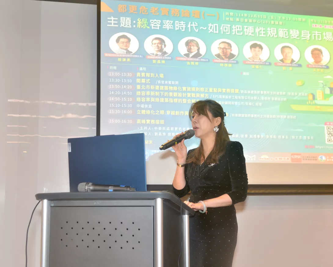 高峰論壇主持人楊謙柔博士在總結時指出,政策目標對城市降溫與景觀改善確有助益,但推動節奏若過於倉促,可能在颱風安全、維護治理與營建成本上升等面向放大風險,反而削弱社會接受度。他建議應有更清楚的過渡期與配套,並由公部門建築物率先示範、再逐步擴及民間。