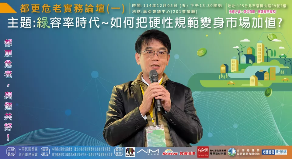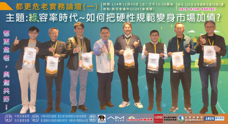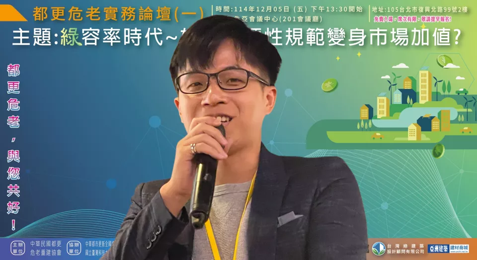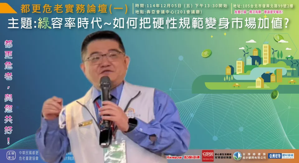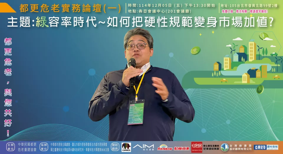 綜合本次論壇多數與會者提出共識性建議:「先公告基準(植栽屬性表)、先公部門示範、先處理小基地例外機制」,並同步補上設計認定、審議作業與維護基金等配套。業界期待透過滾動式調整,把綠容率從「年底趕件的焦慮」轉回「城市升級的工具」,讓都更危老在降溫、韌性與市場可行性之間找到更務實的平衡點。