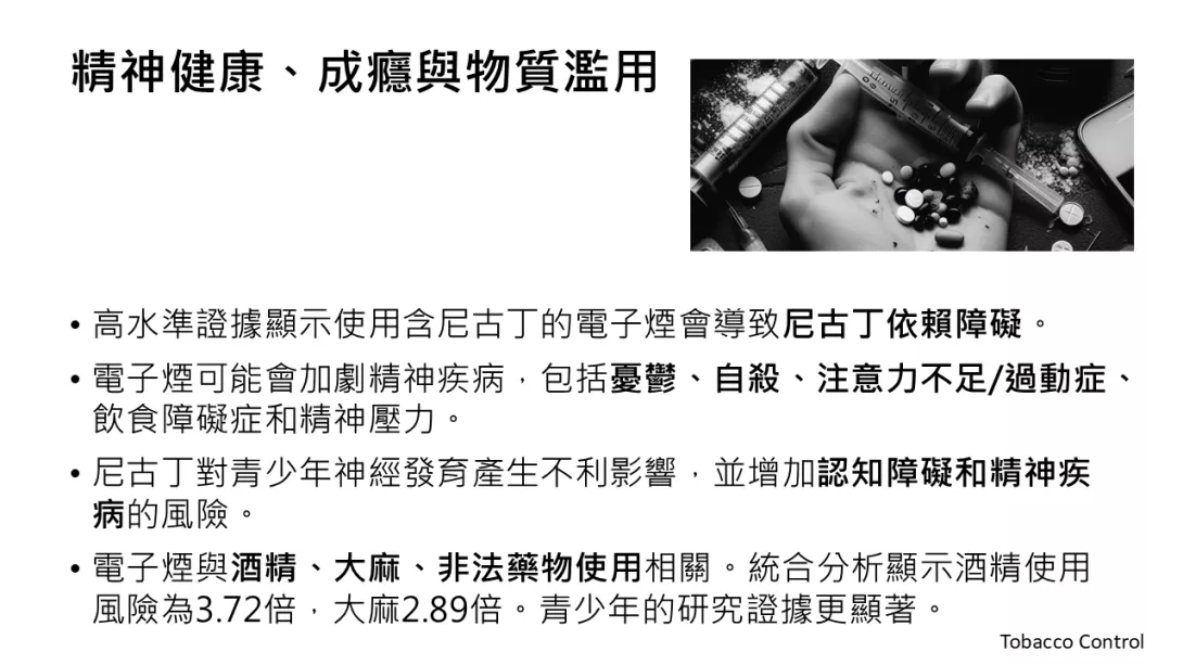 郭斐然強調,新型菸品中的尼古丁成分,對青少年的危害尤其不可忽視。由於青少年腦部前額葉尚未發育完全,尼古丁會干擾神經發育,增加認知障礙與精神疾病的風險。此外,有強烈的證據顯示電子煙的使用與酒精、大麻等多重物質濫用行為相關。