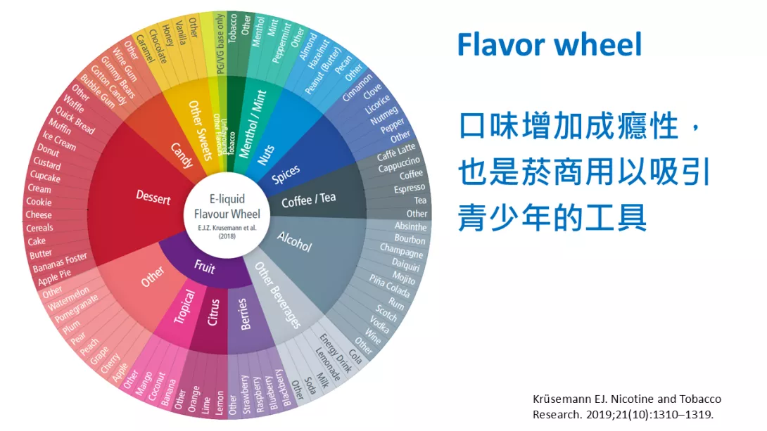 郭醫師進一步指出,雖然台灣《菸害防制法》明定禁止加味菸品,但法律執行至今已超過2年半,政府仍未公告如何禁止加味菸;也因為政府曾預告禁止花香、果香、巧克力、薄荷口味加味菸品,菸商就「超前部署」,以「概念性口味」(如紅寶石、綠洲珍珠)來規避台灣法規可能的限制,吸引年輕人嘗鮮。