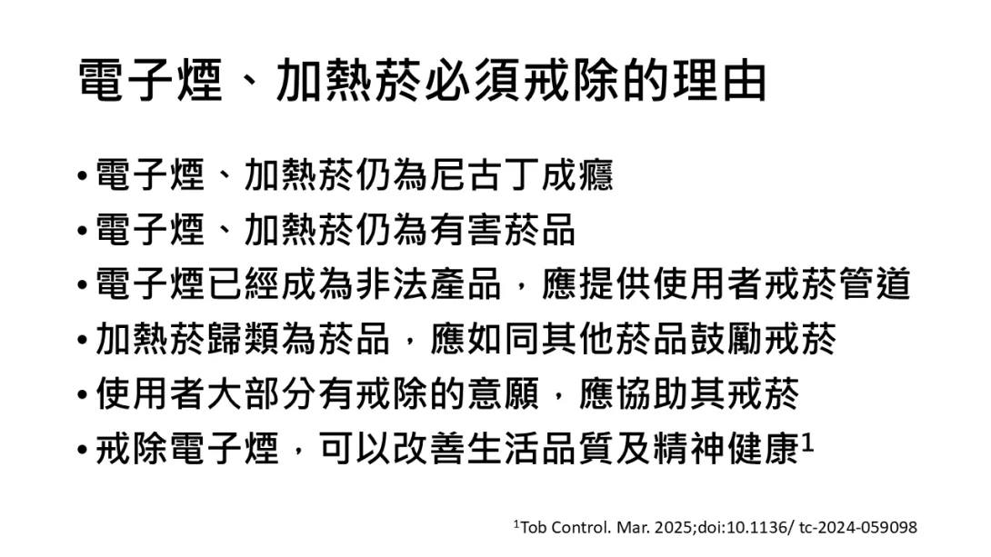 最後,郭斐然醫師呼籲,目前針對加熱菸戒除的臨床證據和研究有限,面對新型菸品,台灣不能等到有新型菸品專屬的認證藥物或系統性指引時,才開始推動新型菸品戒菸。他認為,加熱菸屬於菸草產品,可以比照紙菸的做法,將現有戒菸藥物的臨床適應症擴大適用於加熱菸,保護下一代免於新型菸品的危害,實現全面菸害防制目標。