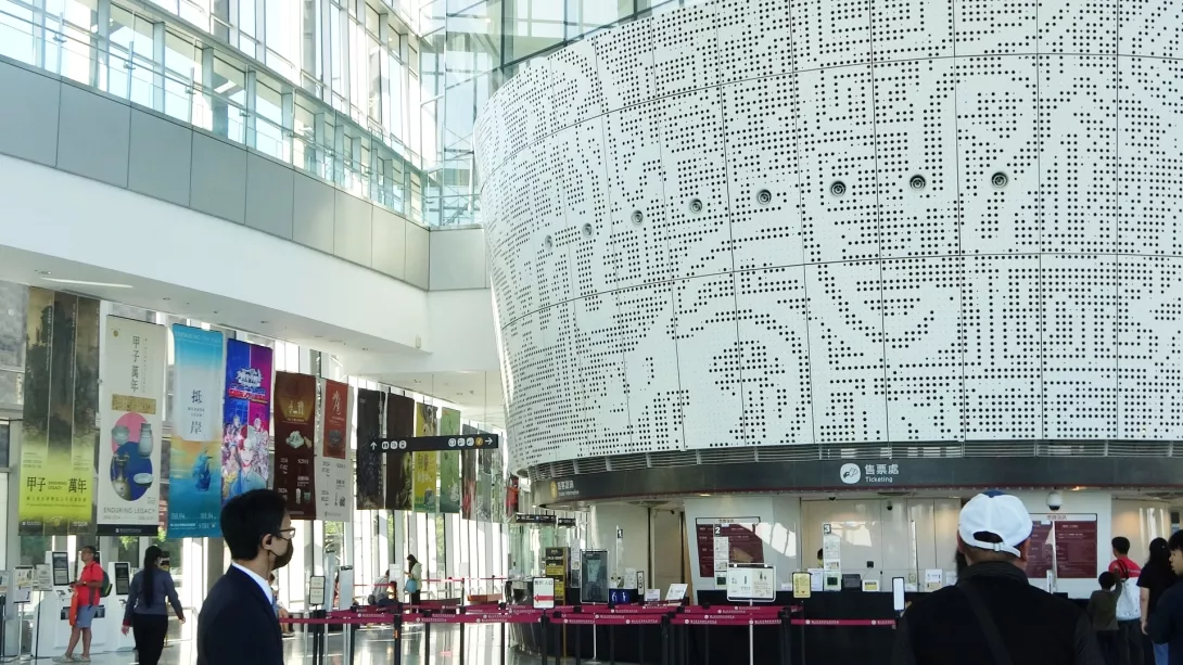 國立故宮博物院南部院區售票大廳,假日期間人來人往,許多特展的海報陳列在旁。【記者 鄭羽婕/攝影】
