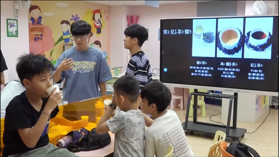 修課大學生教導國小孩子分辨茶的種類,並提供不同茶種讓孩子試喝。【記者 鄭羽婕/攝影】