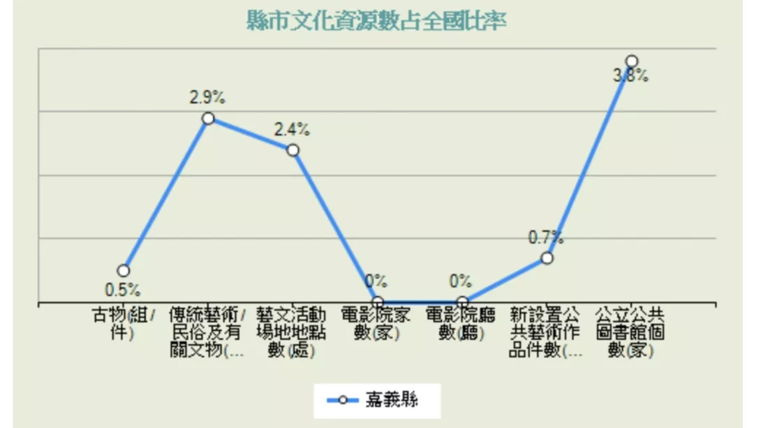 嘉義縣民國110年文化資源數占全國比率偏低,顯示出文化資源數的落差。【記者 鄭羽婕/擷取自中華民國文化部縣市文化統計視覺化查詢專區】