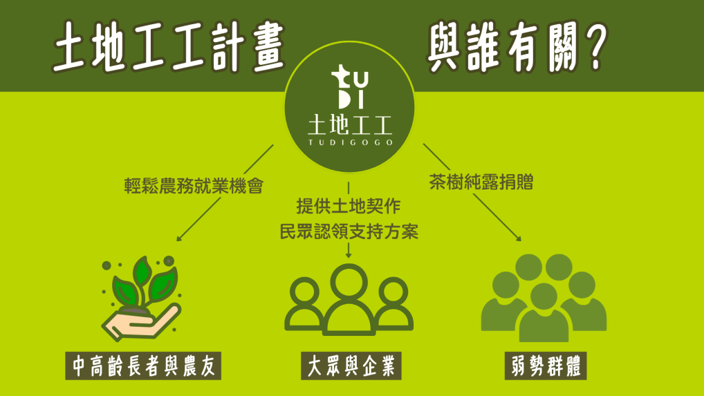 經過14個月的實驗種植、學習技術並走訪,「土地工工計畫」正式成形。計畫透過建構土地工工官網,媒合閒置土地與社會資源,家中有廢棄或閒置土地的地主可以填寫合作申請表單,提供土地,大眾與企業則可透過認領機制共同支持。土地工工團隊在取得契作地後,會於土地周邊的村里進行宣導,邀請有意願的高齡長者參與茶樹栽種與管理等輕鬆農務,成為土地的「園丁」;自己有土地的長者也可以成為地主與執行輕鬆農務的契作者,這樣不僅能夠提供有就業意願的高齡長者工作機會,也讓閒置土地重新獲得生機。後續團隊也會將募資而來的經費投入種植茶樹,並提煉成具有經濟價值的純露,提供給泡泡龍病友與服務身心障礙者的明倫小作所。