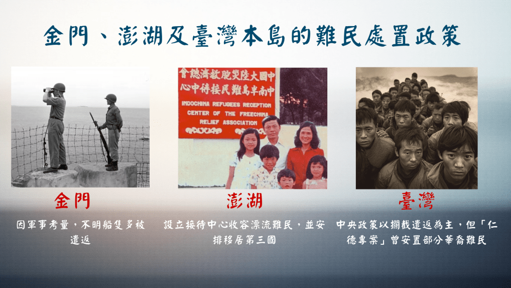 ↑圖中比較金門、澎湖及臺灣本島的難民處置政策,金門以軍事遣返為主如1987年三七事件,澎湖設立中繼收容中心安置漂流難民,臺灣本島則以遣返為主並有限度安置特定華裔難民如仁德專案。製圖/賈上萱、圖片來源/聯合報系資料照片(金門)、《彼岸他方》劇照(澎湖)