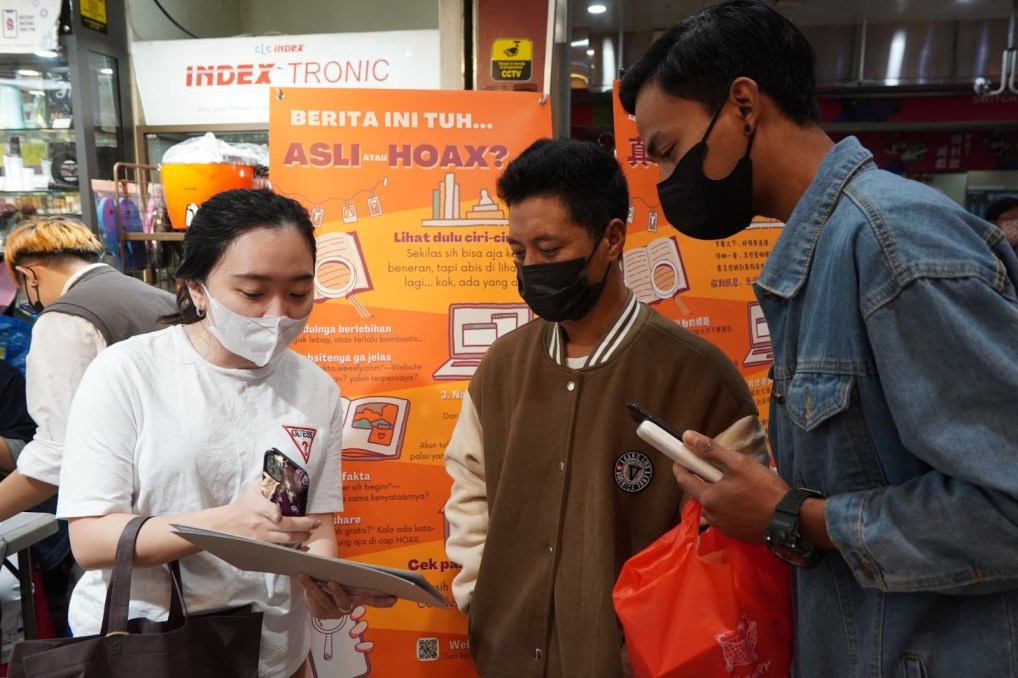 活動以印尼文進行,參與者只需三十秒回答兩個問題:「你覺得這是真的還是假的?為什麼?」有人覺得是真的,有人認為是假訊息。成員再說明判斷依據與查核方法,像是核對來源、觀察語氣與用詞。這樣的互動讓識讀變成輕鬆可玩的學習。