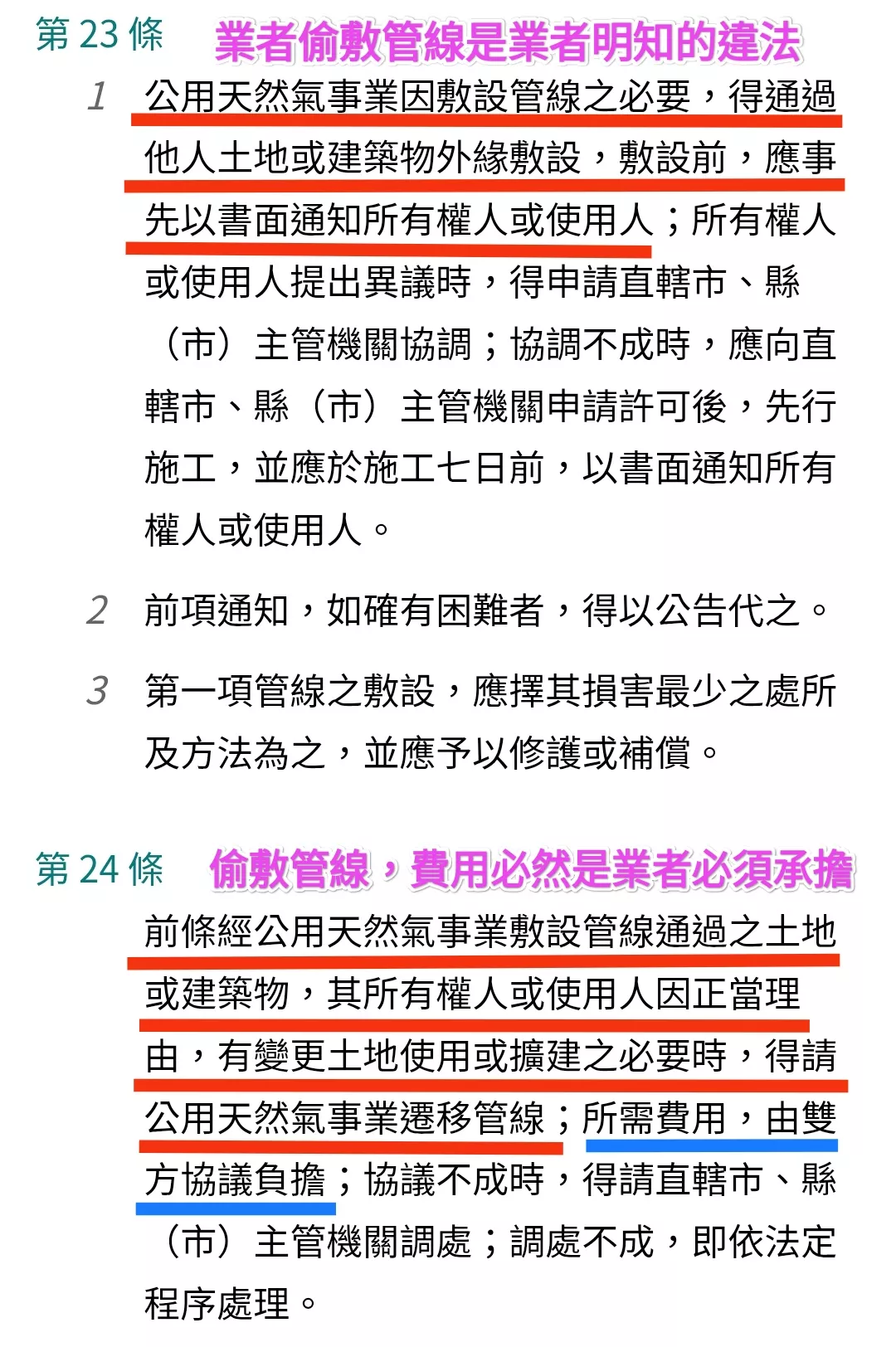 天然氣事業法第23條法令,僅寫「建築物外緣」,可沒有寫「輸送管線可以侵入私人產權區」唷!