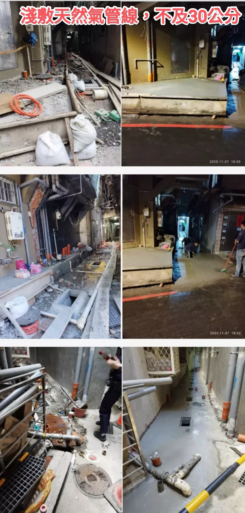 恕不知,原先偷敷在外牆、樓板管線,居然不下移地面,且新置管線淺敷,根本沒有依據施工規範。