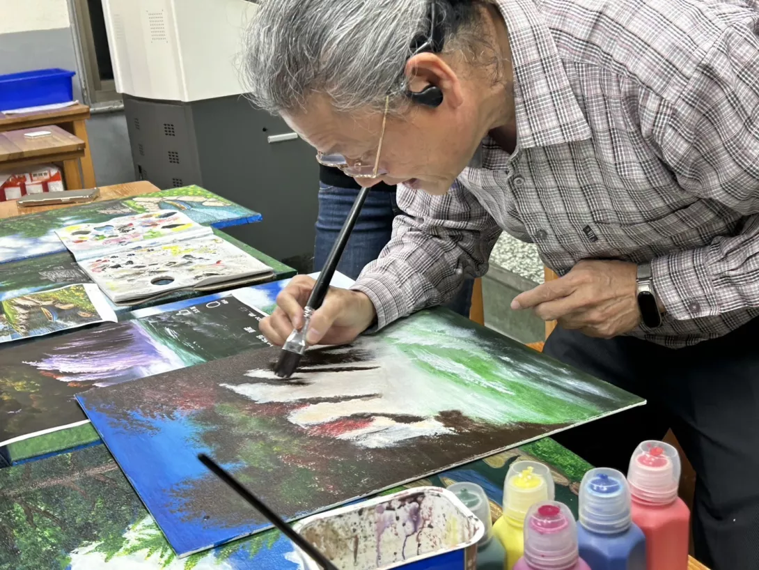 學員們在老師的指導下,學習將平凡的顏料轉化為栩栩如生的景物。桌面上擺滿了色彩鮮明的畫作和顏料瓶,他們用一筆一畫的耐心與熱情,將一幅幅充滿生命力的擬真畫作帶入現實。這堂課不僅是技藝的傳授,更是生活美學的體現,讓中高齡的學員們透過藝術,找到屬於自己的第二人生色彩。