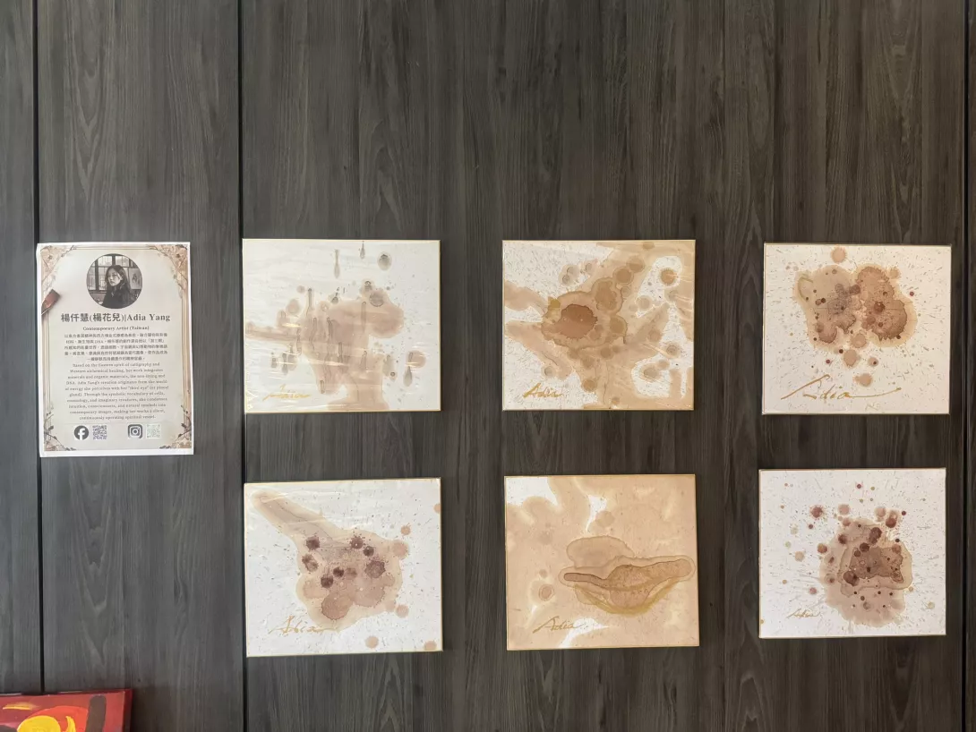 One of the most anticipated highlights is the debut of a new body of work by Taiwanese contemporary artist Adia Yang, presented internationally for the first time. Working on 24 × 27 cm mulberry paper boards, Yang integrates red wine, ink, acrylic, and gold powder to translate the energy world perceived through her “third eye” into subtle, poetic visual compositions.