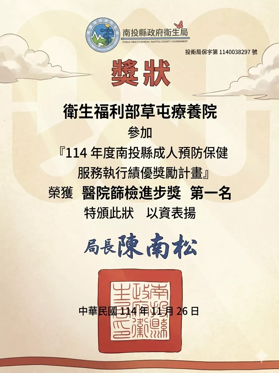南投縣政府衛生局指出,草屯療養院近年在成人預防保健服務與健康篩檢推動上持續精進,透過跨專業團隊合作、流程優化與民眾健康識能提升,有效提高篩檢可近性與參與率,落實早期發現、早期介入的公共衛生核心目標。此次獲獎,不僅肯定草屯療養院醫療團隊的專業與用心,也彰顯其在守護南投縣民健康、推動縣內健康政策上的重要角色。