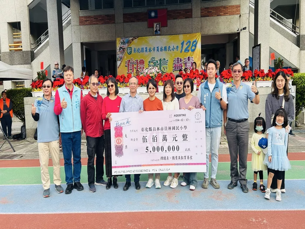 彰化縣歷史悠久的員林國小日前隆重舉辦建校128週年校慶活動,現場冠蓋雲集,來自地方各界的民意代表、首長及教育界人士齊聚一堂,向學校表達祝賀之意,共同見證這所彰化縣資深學府在軟、硬體建設上持續蓬勃發展的重要時刻。校慶活動中,校長蕭勝斌宣布一項振奮人心的喜訊,校友陳昭吟與夫婿黃志超,特別以前教師父母陳鐘熹、魏貴美名義捐贈新台幣500萬元,成立「員林國民小學陳鐘熹、魏貴美教育基金」,作為未來校務發展與獎助學習的重要基石,現場報以熱烈掌聲。