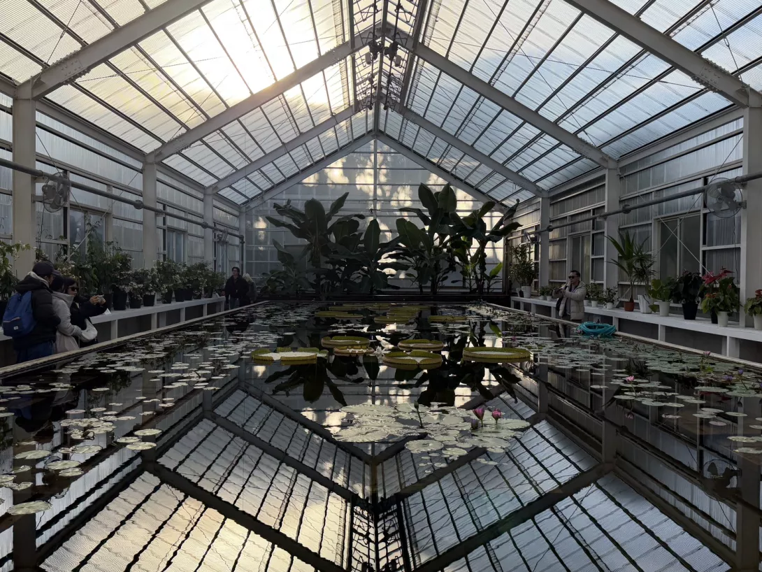 園區裡還有一座溫室,利用地熱與水氣培育熱帶植物。一走進去,立刻感受到悶熱與濕度,和外面完全不同。巨大的王蓮葉片攤開在水面上,像一個個天然的綠色托盤。看到解說才知道,成熟時甚至能承重孩童,真的讓人佩服自然的設計。