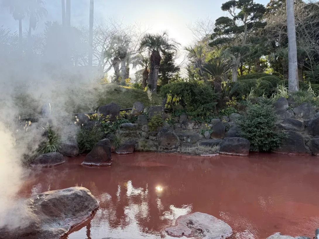 離開主池後,動線來到赤池與足湯區。赤池的顏色和海地獄形成強烈對比,再一次讓人感受到地質條件如何改變水的樣子。