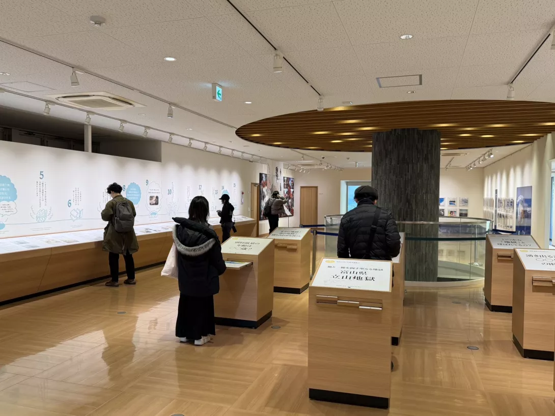 一樓的伴手禮商店延續著海地獄的主題氛圍,販售不少結合地熱溫泉特色的限定商品。走進二樓的導覽中心後,才是真正理解海地獄的開始。透過展覽與說明,可以知道這片藍色是怎麼形成的、別府地獄群背後的地質結構,以及人們如何在不破壞自然的前提下,利用溫泉能源。
