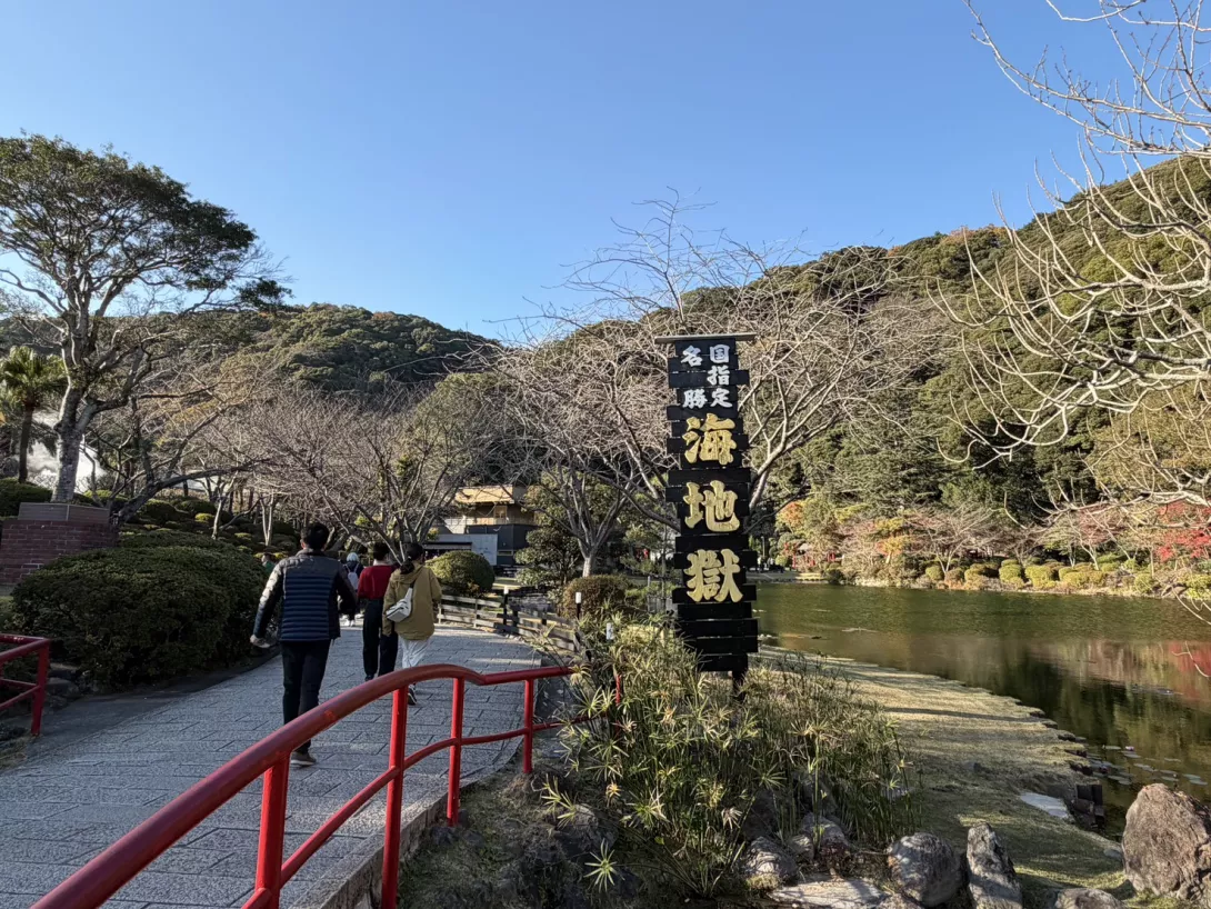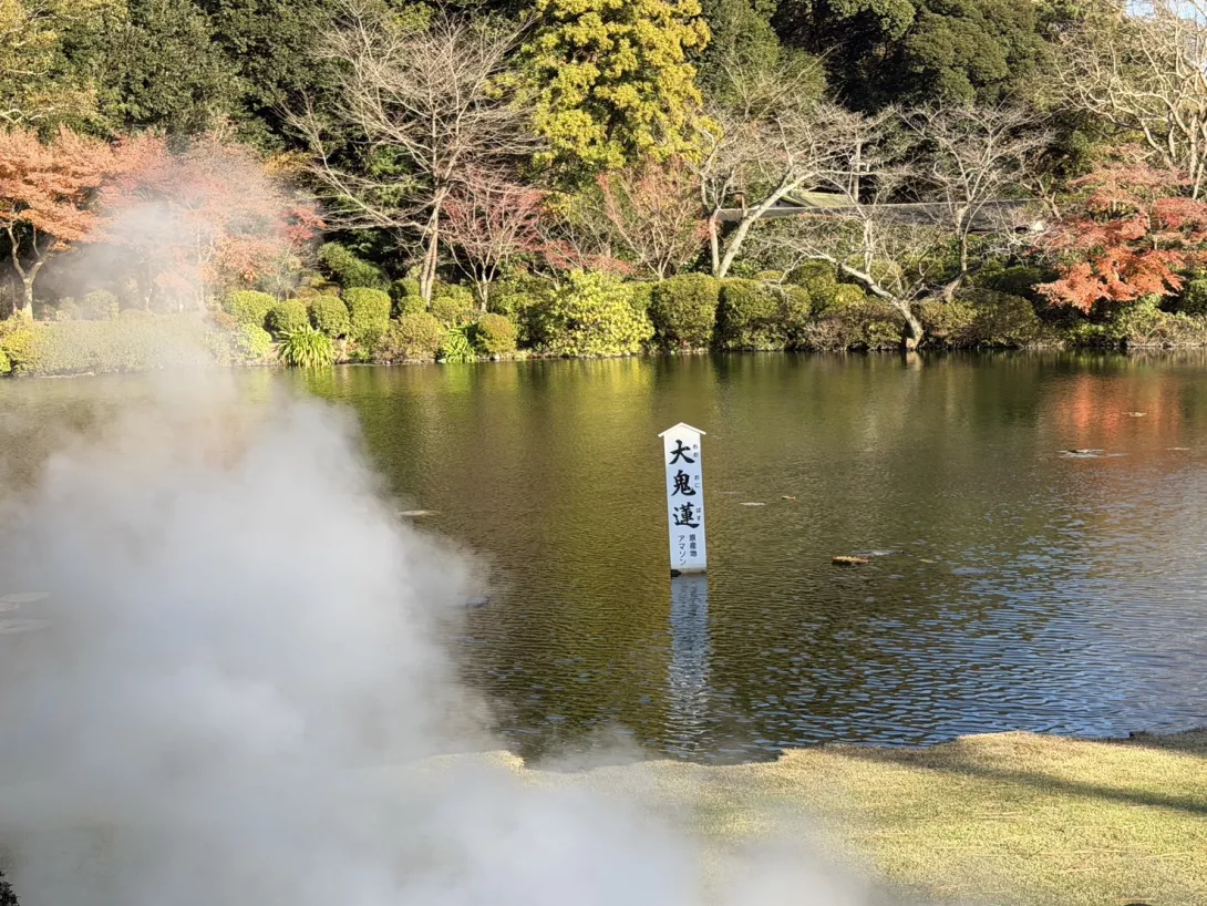 進入園區後,動線先帶人來到「蓮之池」。池面平靜,氣氛和即將看到的海地獄完全不同,像是一個溫柔的緩衝。這裡的植物不是被呵護的展示品,而是順著地熱與水氣自然生活。站在池邊,可以感受到一種很安靜、卻很堅定的生命力,就算在火山地帶,生命還是會找到屬於自己的位置。