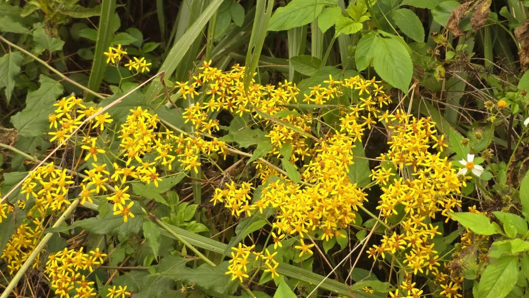 現在對面看過去現在有各種顏色的紅色的橘紅色的,這邊就是馬鞍,那馬鞍呢,曾經在民國50年代前後呢,栽種了很多的楓香,這些楓香原本種來是要作爲香菇的段木用的,就是要栽種香菇,可是等到他們長成快要可以砍的時候呢,太空包的這種種菇的技術就引進臺灣來,用太空包種香菇的那個成本很低嘛,所以香菇的市價就大跌了,所以他們就放棄了,結果這一些楓香林呢後來逃過一劫,因爲有這些楓香在這裏,讓這整條路的風景更好,甚至很多人就是專門爲了這些楓香的馬鞍的楓香來霞克羅古道健行。