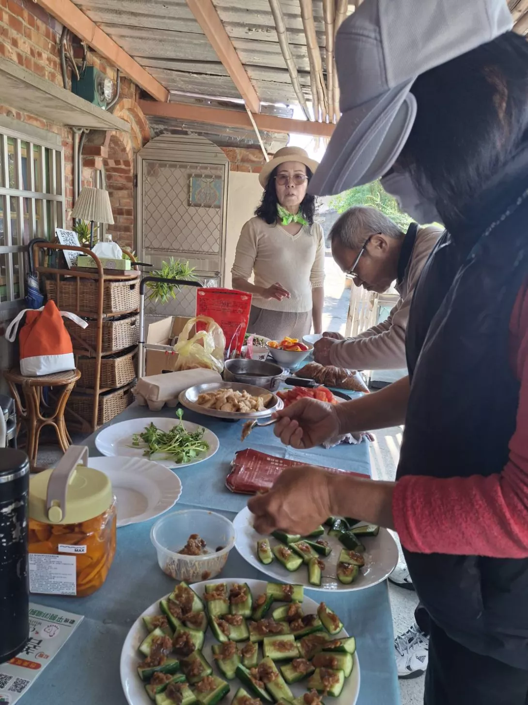 今日共享餐桌上的菜色豐富,蘋果洋蔥醃製健康醋,小黃瓜佐日本味增,杏鮑菇蘿蔔糕,炸餛飩,健康滷豆干,炒三色鮮蔬,百香果汁醃製南瓜片,綠豆湯,黑糖湯圓,高山蜂蜜優格,素食素雞湯,檸檬蜂蜜醋,靈芝咖啡……令人食指大動,胃口大開。大家用餐完畢,聊天休息,再走入田園間,散步消食,自在安逸。