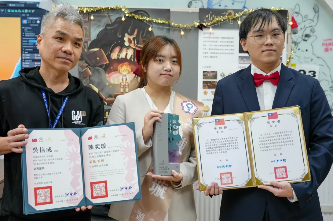 ▲資管系大四學生陳奕璇(中)榮獲第54屆全國技能競賽3D數位遊戲藝術職類(青年組)金牌及正取國手資格,並勇奪第3屆亞洲技能競賽銀牌。