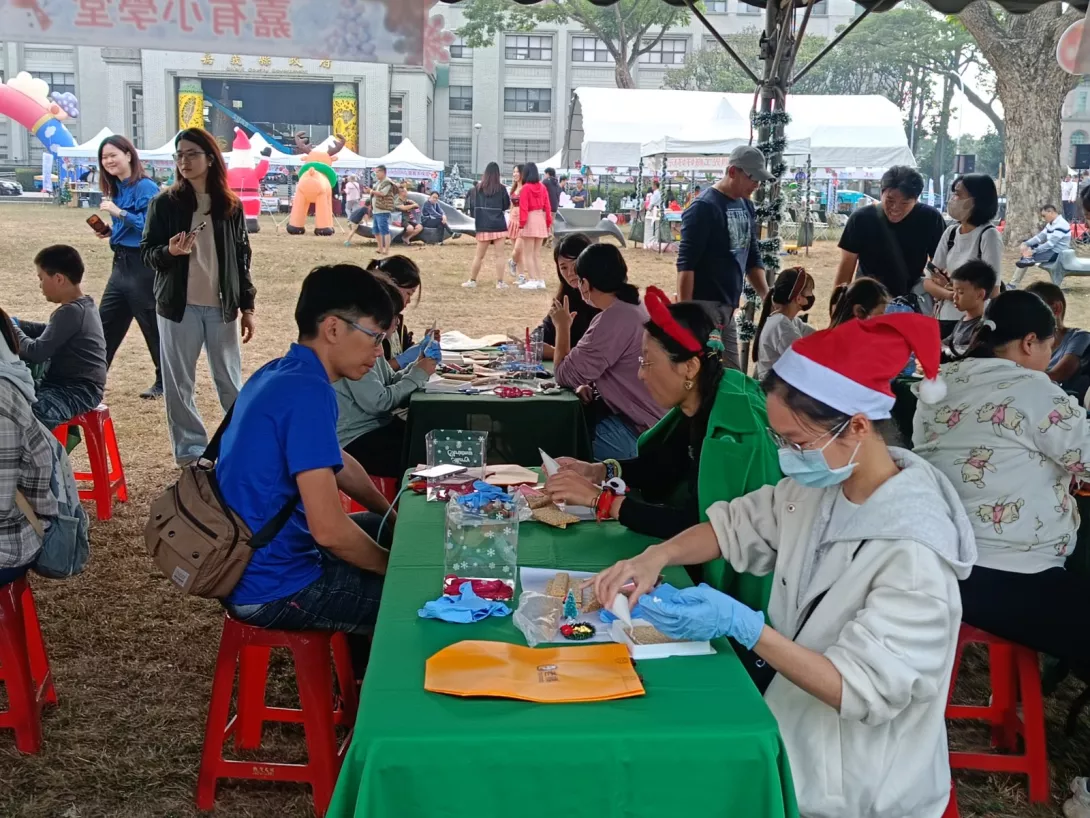 縣長翁章梁化身耶誕老人發糖果,吸引大小朋友爭相排隊,感受溫馨氛圍。現場觀光工廠親子DIY大排長龍,兒童快樂製作薑餅屋。