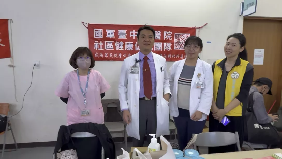 義診活動強調「全齡健康照護」由國軍台中總醫院—也就是大家熟悉的 803 醫院——提供現場血壓測量血糖檢測,協助民眾掌握健康狀況。