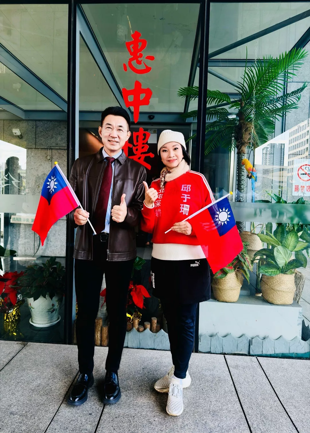 圖說:立法院副院長江啟臣(左)台灣民眾黨台中選哲之友會「總會長」邱于珊于珊(左)元旦升旗共許「藍白合,攜手勝選」新願。