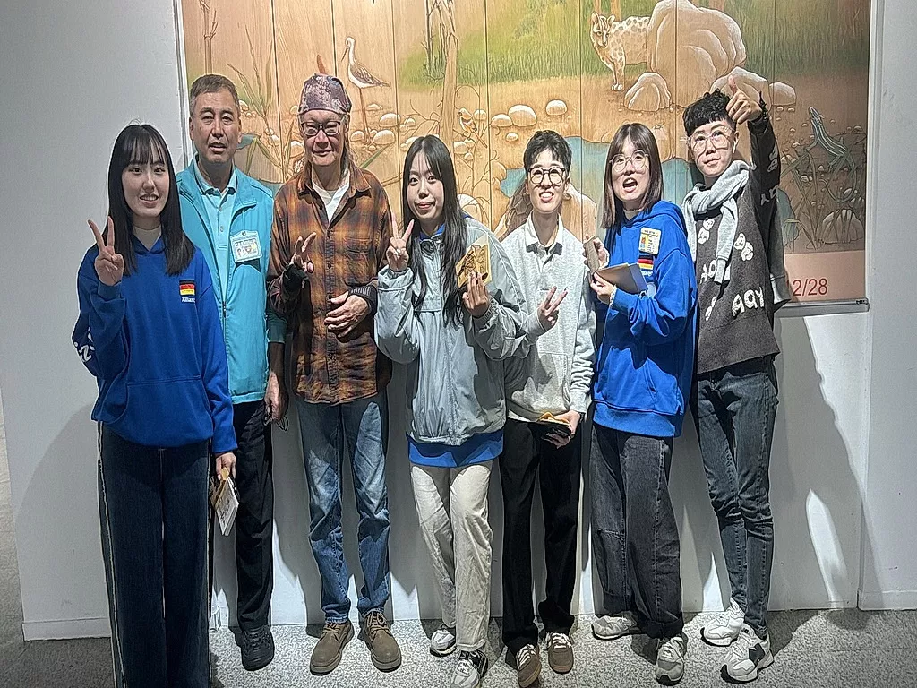 ▲有幸目睹AI繪畫生成技術,觀賞者與創作者高智能(左三)合影留念。(圖/記者周厚賢攝)