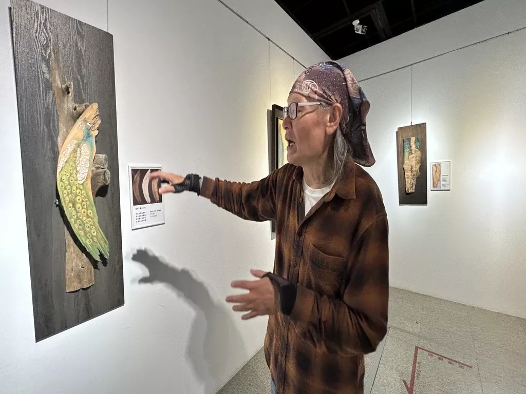 ▲高智能將台灣檜木板上的紋路激發出創作靈感,透過AI的協作而能創造出圖案與文詞介紹。(圖/記者周厚賢攝)
