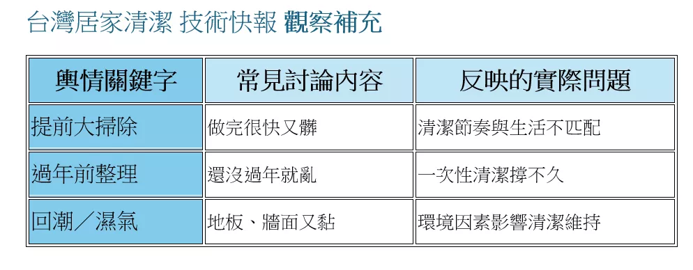 從本期網路輿情可以清楚看見,居家清潔的公共討論,已不再停留在工具、價格或單次成果,而是全面指向「清潔如何融入生活節奏」的問題。