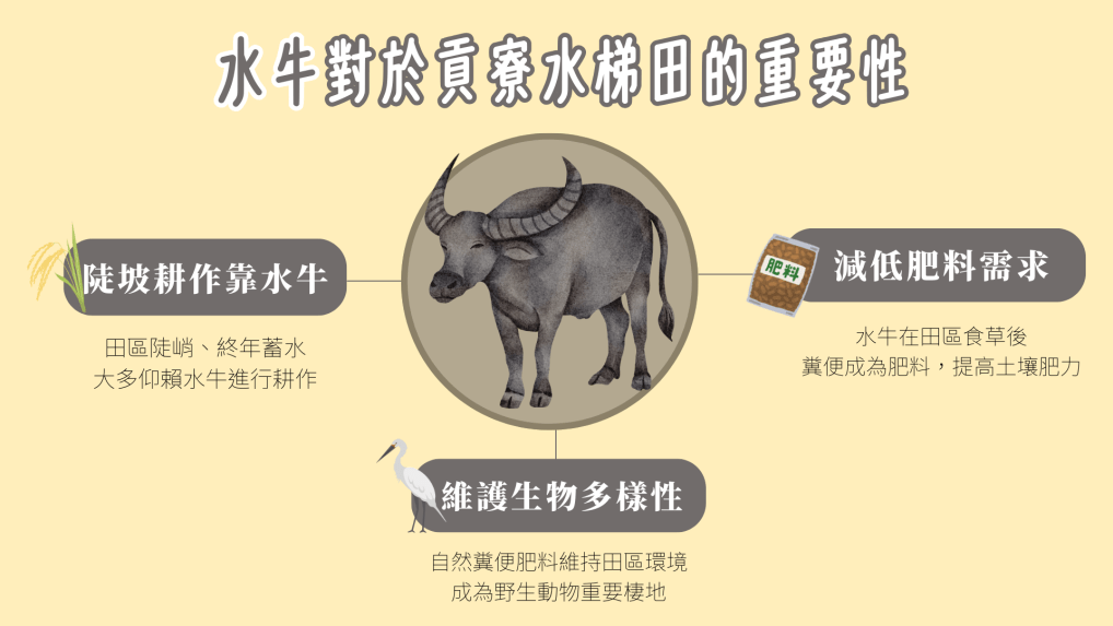 蘇淑君說,水牛耕作屬於低度擾動,對田區與自然環境不會帶來太多負擔,因為水牛的糞便可以降低施作化學肥料的需求,讓田區成為了食蟹獴、果子狸、山豬等野生動物的重要棲地,田裡更可以看到許多瀕危的水生植物 。此外,終年蓄水的水梯田像是一座小型水庫,具備涵養地下水、維護下游用水安全及水土保持的功能 。但隨著60、70年代工業發展,貢寮人口大批外流,再加上養牛的經濟誘因斷崖式下跌,用水牛耕田反而變成額外的負擔 。