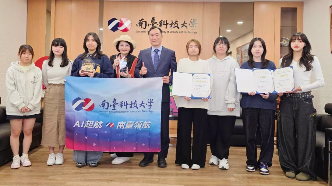 【南臺科大校長黃能富與獲獎指導老師梁丹青及資傳系學生團隊(張芷璇、王佾薰與張馨、張琇婷、吳亞倩、張家甄、楊沛璇)合影,共同分享榮獲全國徵影大賽三大獎項的喜悅。】