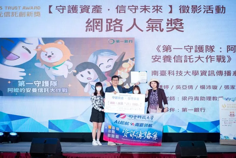 【邁肯行銷董事長暨執行長張志浩頒發「網路人氣獎第一名」予南臺科大資傳系團隊,由張琇婷、吳亞倩代表領獎。作品憑藉 2,675 票 超高人氣奪冠,成功將安養信託觀念轉化為具傳播力的校園教育素材。】