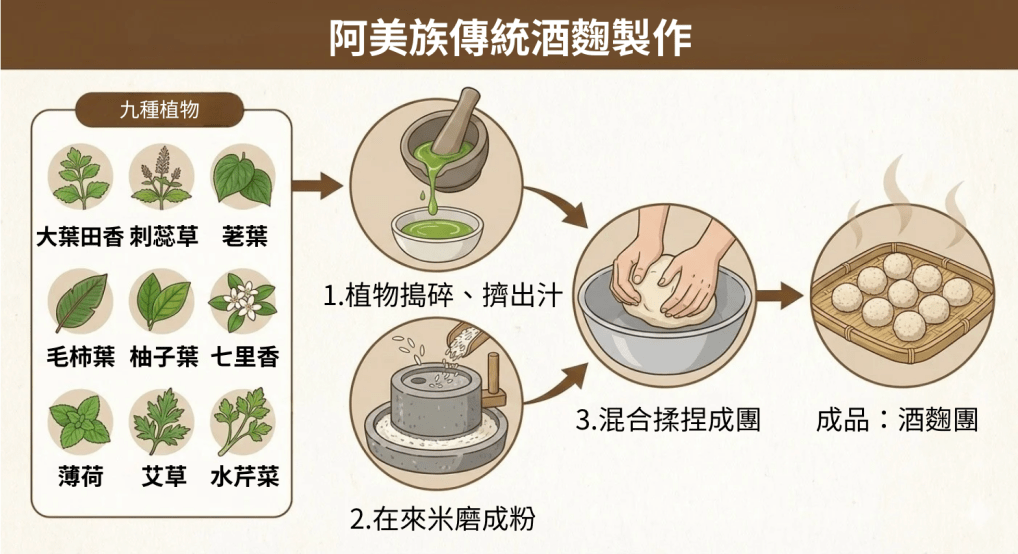 酒麴需由九種植物混合製成。大葉田香是最主要的成分之一,屬於水生植物,也是酒的香氣來源,同時能促進菌絲發展。其餘植物包含刺蕊草、荖葉、毛柿葉、柚子葉、七里香、薄荷、艾草,以及生長在水圳中的水芹菜。這些植物皆需在未使用農藥與有機肥的自然環境中採集。製作時,先將這些植物打碎、擠出汁液,再將再來米磨成粉後混合其中,揉捏成團,並依照實際釀酒所需的米量,調整酒麴的重量與大小。目前每顆酒麴約為二十五克,會依比例對應糯米的使用量。