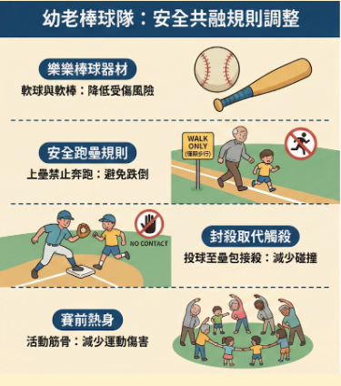 由於傳統棒球的難度較高且強度較強,課程設計必須經過調整以確保長者與幼兒的安全。團隊採用「樂樂棒球」的方式進行,透過正式的棒球規則比賽,並進行兩項關鍵調整:首先是安全規則,上壘時不允許跑步,只能用走的,避免長者因快速移動而跌倒受傷。其次是出局機制,不使用球觸碰跑者的觸殺方式,而是改為「投球到壘包上做接殺刺殺出局」,降低碰撞風險。此外,課程開始前都會進行熱身運動,讓參與者先活動筋骨,減少運動傷害,確保大家能平安順利地完成課程。
