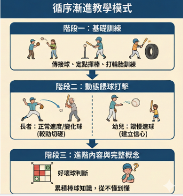 課程設計採循序漸進的教學方式,從最基礎的傳接球開始,進行定點揮棒打擊、打輪胎訓練、固定打牆等知識與動能訓練,逐步建立棒球基本功。接著進入動態的餵球打擊階段,投手長者們會根據對象調整投球方式,對長者採用正常速度投球,甚至會投變化球較勁切磋,學習職業棒球的投球技巧;對幼兒則故意「餵慢速球」讓他們打得到,幫助孩子建立信心和興趣,避免因挫折而放棄。隨著技巧提升,課程逐漸加入好壞球判斷等進階內容,讓參與者從不懂到懂、從技巧不會到會,慢慢累積對棒球的完整概念。