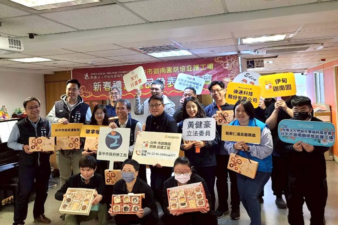 隨著農曆春節腳步接近,伊甸基金會台中市迦南園烘焙庇護工場日前(6日)舉辦「春節禮盒推廣記者會」,台中市政府勞工局副局長羅群穆、台中市政府運動局、徠通科技股份有限公司、富易達保險經紀人、玻拿咖啡館等貴賓及多位議員代表皆到場參與,號召社會大眾一同以行動支持身心障礙朋友穩定就業,讓年節祝福更具意義。