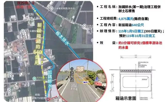 此次縣府全額挹注4,875萬元經費來辦理「加錫排水(第一期)治理工程」,範圍自正興巷與錫安路746巷交會處(加錫排水0k+564)往北,至板本排水陝西橋上游,新設箱涵約640公尺,透過箱涵分流的方式,增加排水系統的通洪能力,將能改善長期困擾地方的淹水問題。