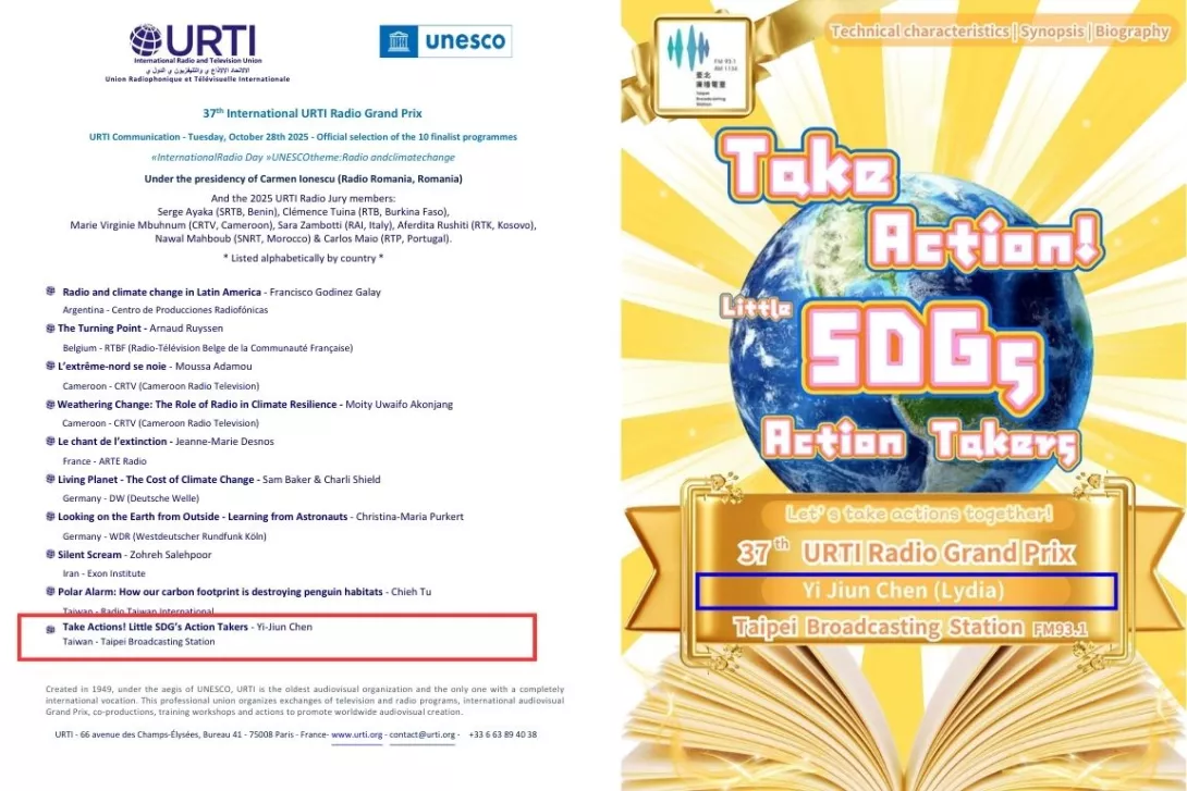 2025 年第 37 屆 URTI 國際廣播大獎以「廣播與氣候變遷」(Radio and Climate Change)為年度競賽主題,聚焦氣候危機下廣播作為公共媒介的角色與影響力。本屆競賽最終入圍名單共選出全球前 10 件作品,來自多個國家與地區;其中,來自臺灣、由臺北廣播電臺製播、主持人陳怡君主持的節目《行動吧!小小地球人!》成功入圍最終名單,躋身全球前 10 強,展現臺灣公共廣播節目在國際舞台上的專業實力與公共價值。