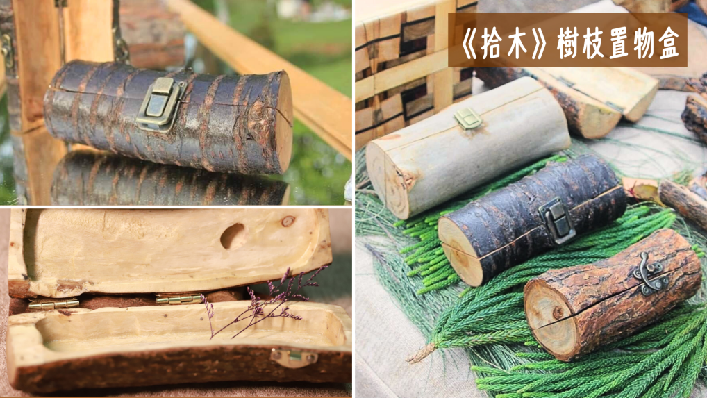 ↑《拾⽊》樹枝置物盒取材於⾏道樹修枝之廢⽊料,保留原⽣樹⽪,並⼿⼯挖製其置物空間。每⼀次打開置物盒,都能⼀窺⾏道樹內部的⽊材模樣。製圖/蘇妍柔