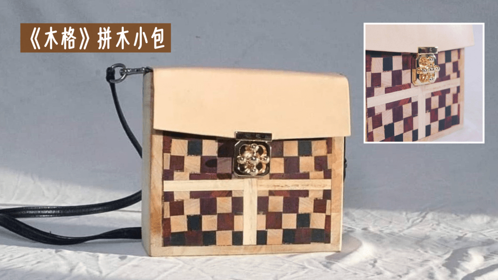 ↑《木格》拼木小包採用泡桐、大葉山欖、茄苳、黑檀、紫心木、楓木、牛皮等材料,以拼木形式結合而成,包內設有拉鍊隔層,可放置手機、錢包等隨身物品。製圖/蘇妍柔